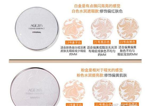 白盒的是侧重遮瑕的,水润遮瑕分21号和23号遮瑕效果非常好好!而粉盒是水润提亮,更侧重于亮肤明显遮瑕效果比白盒差一点点!所以如果斑点多需要特别遮瑕的MM可以选择白盒,再根据自己的肤色选择色号就行了!如不需要特别遮瑕的亲白盒或粉盒都可以选择!