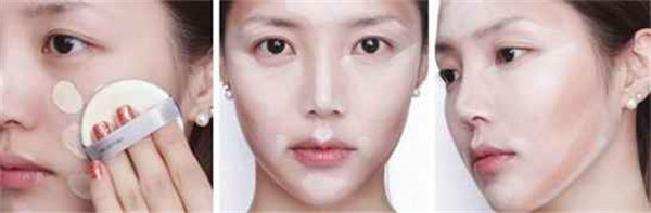 STEP1:在全脸点上水润型的粉底液,然后用气垫粉扑均匀拍打开。 STEP2:在脸部中央位置点上浅色的遮瑕膏,脸部轮廓处点上深色遮瑕膏,打造立体效果。 STEP3:从侧面看就是这样,按照图示涂抹好。