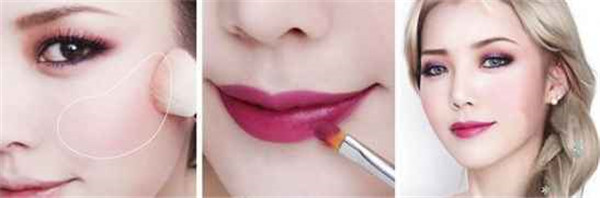 刷腮红,涂紫色唇膏,完成