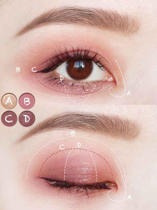 1.B色当作基础底色,在眼窝处铺底色,下眼睑周围也不要忘记哦!这个颜色跟肤色还蛮好融合的,不用担心会下手重。
