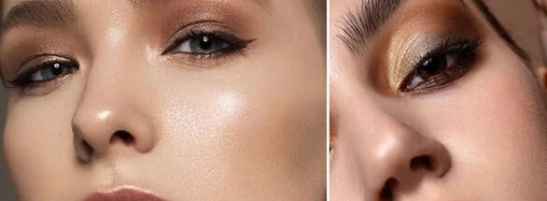Step4:在上眼睑的中间和下眼睑的内眼角至中间区域涂抹上金咖色珠光眼影。