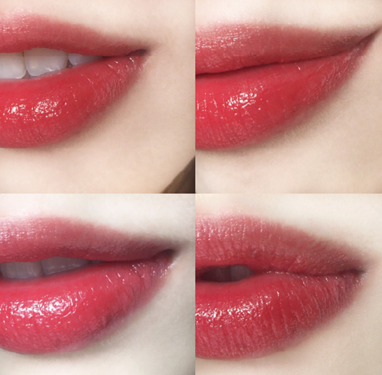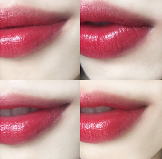 72比40就年轻很多,是个元气的红色,和细管10有点像,但着色更加饱和扎实。膏体也有细金闪,但是上嘴不太明显,红色不挑皮,四级也都适合,算是个不会出错的颜色吧。