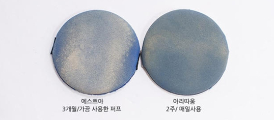 正在使用中的粉扑,肉眼就能看到有多脏。左边是Espoir的,3个月中有时会用的;右边是爱茉莉的,连续使用2周。