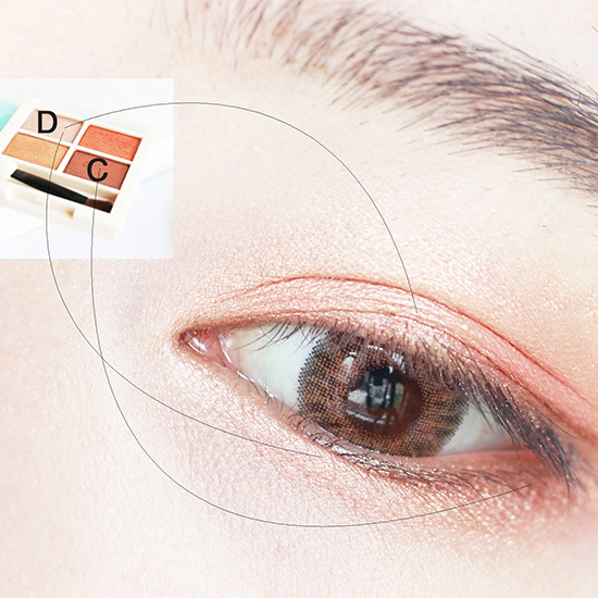晕染刷沾取浅橘棕色眼影晕染在上眼皮,橘棕色眼影晕染眼头和眼尾以及下眼睑位置。