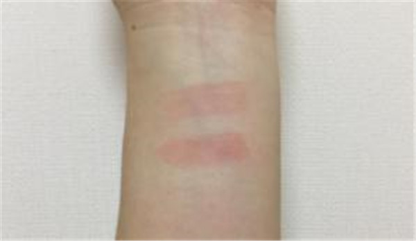 在手臂上的试色可以看得出薄涂颜色很淡,很浅的粉色。厚涂红调相比会明显一点,草莓粉的感觉,依然还是很水润的质地。