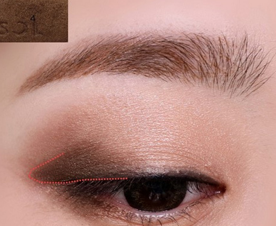 第五步:下眼尾用棕色眼影连接浅棕色到珠光米白色眼影过渡。