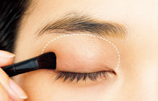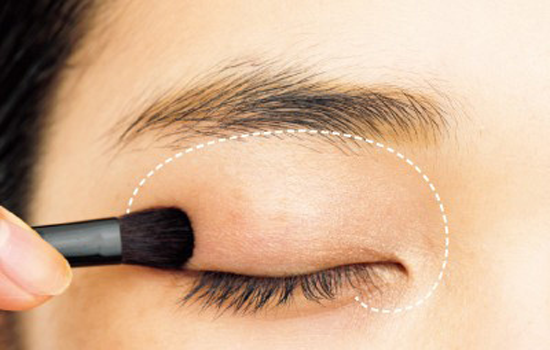 第一步:先用哑光米白色眼影按照虚线面积铺开作为眼皮提亮,增加光泽度。