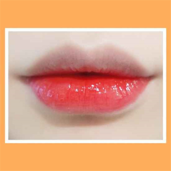 颜色偏橘,薄涂一层的感觉就像润唇膏一样,颜色很浅,非常滋润又有点不明显的橘色感。无论是薄涂厚涂都可构成玻璃唇的效果!