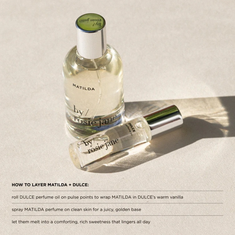 若想营造出如同"焦糖百香果"般的嗅觉效果,品牌建议将Matilda与自家的Dulce香水油进行叠搭:"明亮多汁的百香果与奶油香草、焦糖糖浆层叠交织。甜美温暖,令人彻底沉醉——宛如一款你想穿在肌肤上的焦糖甜点。"