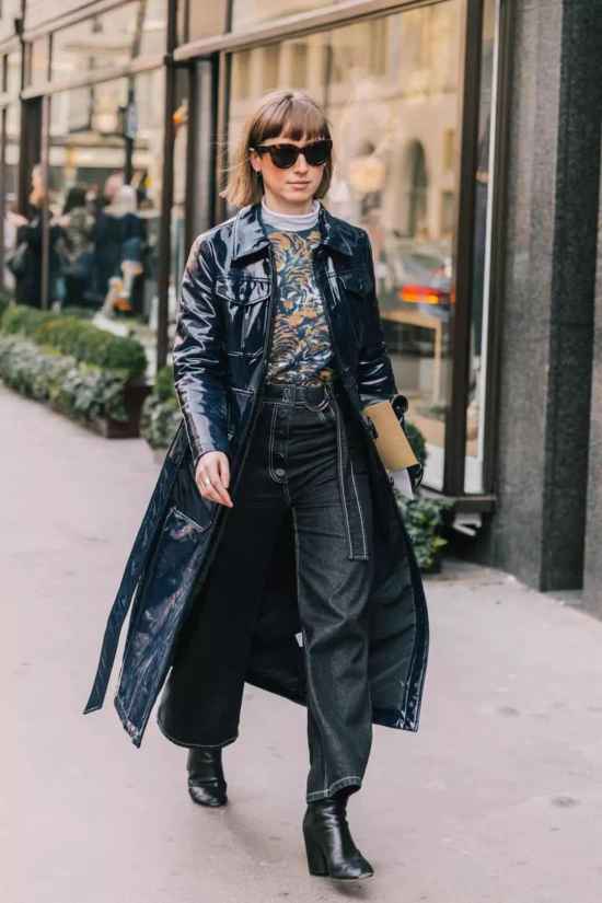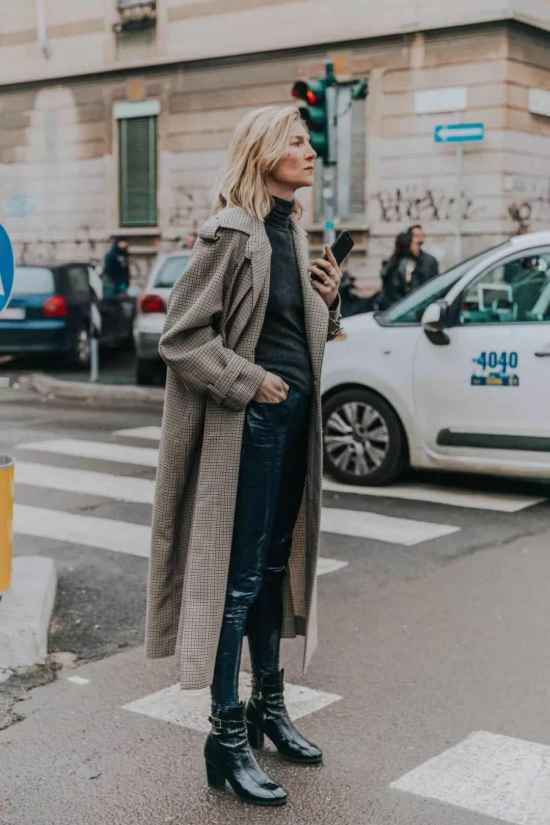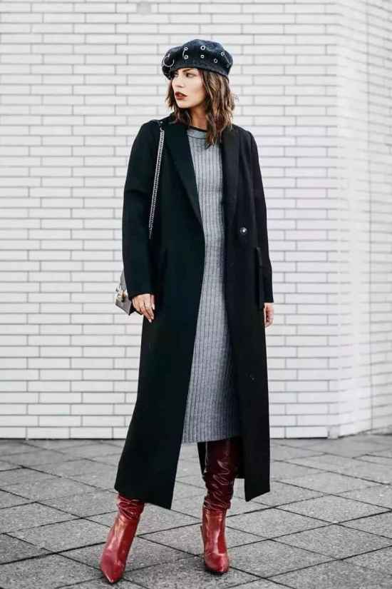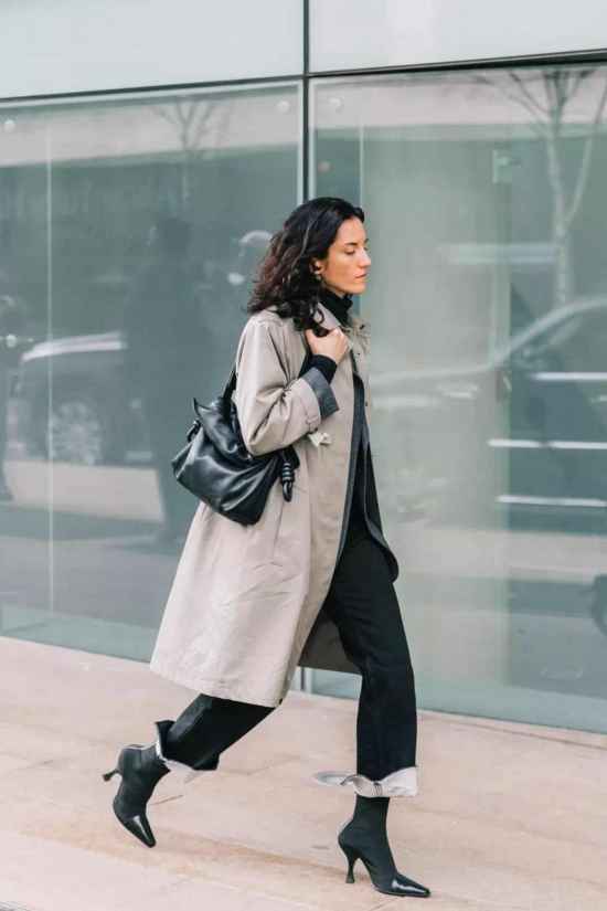 宽松的长款大衣内搭小黑裤,能够形成对比,凸显你的纤瘦。