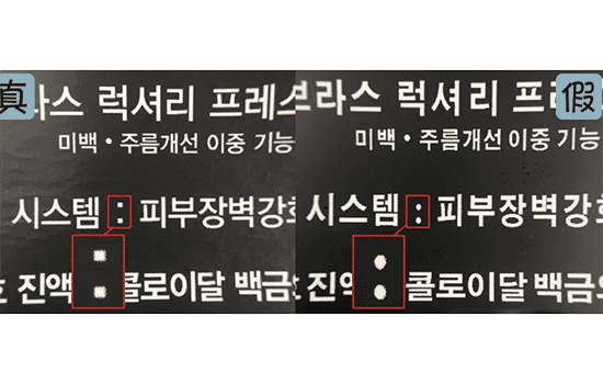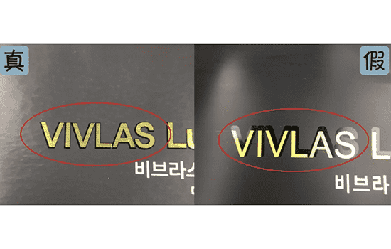 正品上的光滑字体,黑边非常细,假货黑边很大。