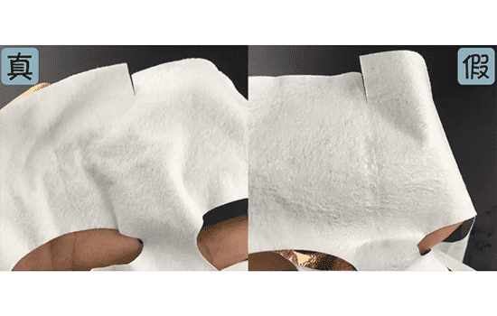 正品的面膜纸背面是厚厚的蚕丝,假货的蚕丝则薄薄的一层,还会露出银色底部。