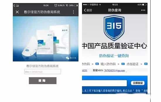 敷尔佳面膜的包装盒上有防伪贴,用微信扫一扫就会出现“敷尔佳”公众号,关注后点“客户服务”,选择“防伪查询”,然后再次扫描二维码,按操作提示刮开防伪贴下方的图层,并输入刮开图层后显露的后8位数字,查询结果不能显示为正品的均为假货。