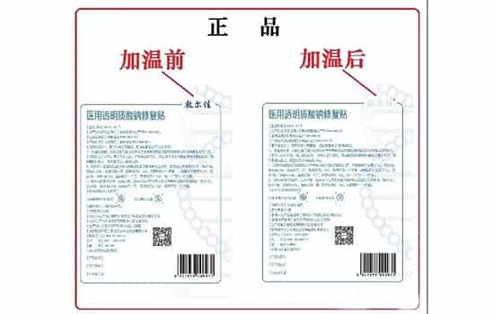 “敷尔佳牌医用透明质酸钠修复贴”产品包装盒背面右上角“敷尔佳”三个字采用温变防伪技术,用手触压数秒钟,因手的温度使其加温后(或其他加温方法),“敷尔佳”三个字颜色变浅或消失,恢复常温后,颜色恢复原样。