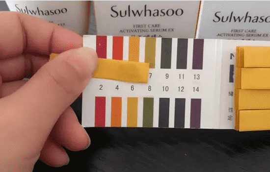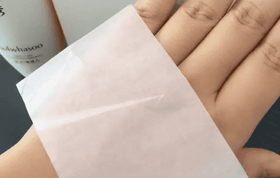 将产品涂抹在PH试纸上,可以看到数值在5到6之间,接近人体PH值,非常温和,敏感肌肤也可以放心使用。产品滴在吸油纸上静置30分钟,周围几乎无出油现象,清爽度良好。