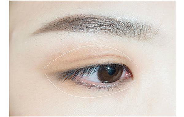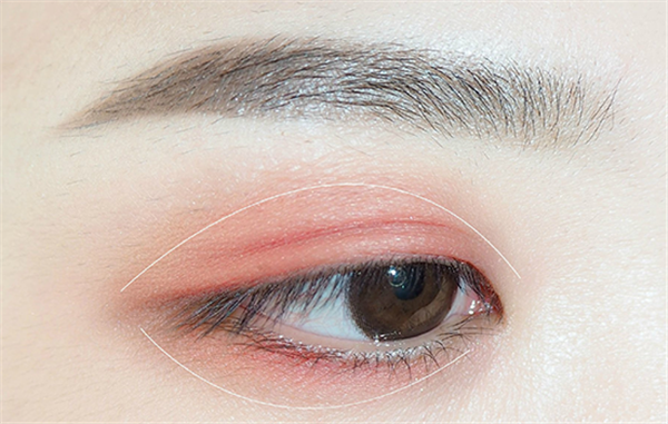 第一步:选择一个哑光肉咖色眼影,先在眼部淡淡的打个底,范围如图。