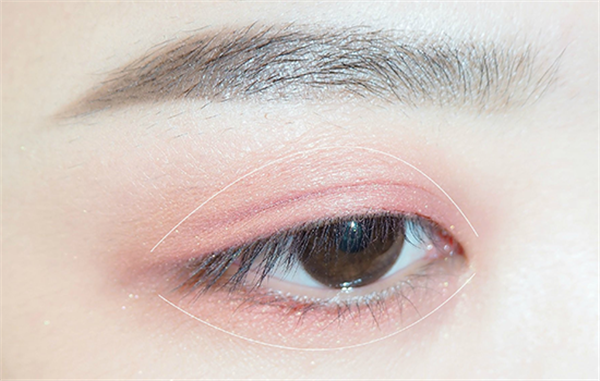 第三步:接着选择人鱼姬色眼影叠加在粉色眼影上,眼头也要刷上,范围如图。