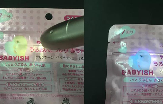 正品包装不含荧光反应,假货包装含有荧光反应。