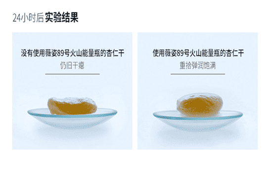 为了检测薇姿火山能量瓶的效果,下面以杏仁干为例,左边是没有使用薇姿火山能量瓶的杏仁干,右边是用了薇姿火山能量瓶的杏仁干。可以看到左边的杏仁干是非常干瘪的状态,而右边的杏仁干看起来则是非常饱满,这说明薇姿火山能量瓶的保湿效果非常不错。