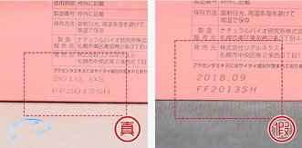 生产日期:对比下图可以看出,正品的生产日期是机器镭射上去的,镭射之后无法改动;而假货则是印上去的。