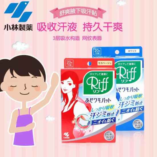 小林制药的产品,采用1毫米的3层吸水性结构,直接贴在衣服腋窝处,使用很方便。对于浅色衣物特别是丝质衣物,用这个太好了,免得因汗渍发黄。这款止汗贴含有酸化亚铅除臭成分,保持腋下干燥清爽,并消除汗味,特别适合大汗族,尤其是狐臭者,为适应不同颜色衣物,有不同颜色,蓝色盒子是白色装,红色盒子是肤色装,另外还有黑色装,也有男士款。
