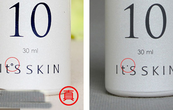 英文品牌名“it’s skin”,对比下品牌英文上的同点,正品的同点呈句号状,中间空心。反之假货的圆点却是实心的。小小的不同点,要细心看才能发现。