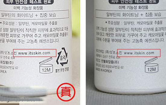 正品的网址为:www.itsskin.com;而假货的网址却是www.itskin.com少了个“s”。
