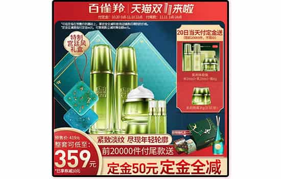 这个套装是今年主推的套装组合,包括精华水90ml+焕颜乳90ml+菁华霜50g+精华液5ml*2。总价值844元,预售价419元,付定金减50+店铺满199减10,实际到手359元,差不多打4.3折。10月20日付定金还送肌初体验装,双11当天前20000件付尾款,还赠送宫廷特制礼。总之是非常豪华的阵容就对了!