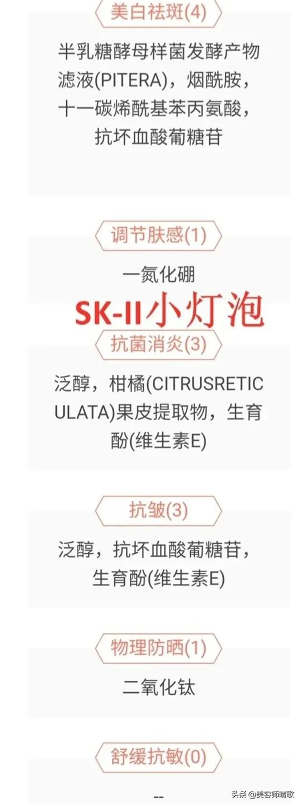 半乳糖酵母样菌发酵产物滤液——美白淡斑、保湿、调节皮肤、抗氧化烟酰胺——美白淡斑甘油——保湿泛醇——保湿、抗氧化、消炎舒缓、抗皱柑橘果皮提取物——保湿、抗氧化、舒缓修复生育酚——保湿、抗皱、抗氧化二氧化钛——防晒(涂完皮肤会增白)