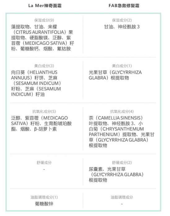 两者相比,lamer贵在含有昂贵的深海海藻提取物,但好在FAB有神经酰胺撑着,性价比很高了。