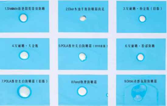 点评:从图中可以看出,旧版POLA的出油情况最厉害,其次是资生堂和安耐晒大金瓶。并不是说油分多就是不好,也要跟质地和吸收程度相挂钩,像是本身皮肤比较干的妹妹就可以选择滋润度比较好的防晒。