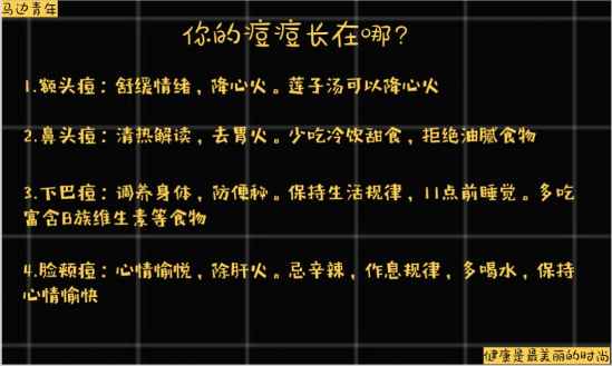 不同位置的痘痘代表了不同的身体状况,也要采取不同的措施,如下图: