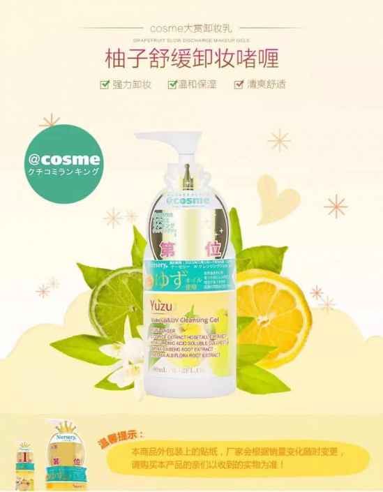 CO**E卸妆部门第一名,在日本人气非常高!药妆店经常卖到脱销。用过的人清一色给出了好评,口碑杠杠的。Nursery柚子卸妆啫喱,清洁力很强。面部、眼部、唇部的彩妆、隔离都可以轻松卸除干净,并且卸妆清洁一步到位,无需后期洁面的哦。