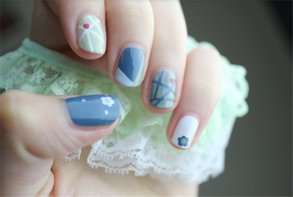 2、黄色+绿色混搭型美甲