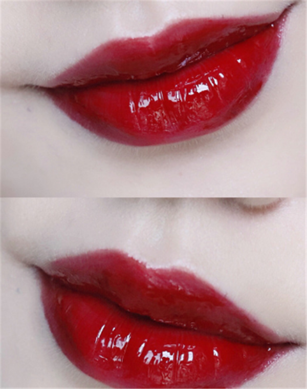 有点像苹果红,娇艳欲滴的感觉,元气少女必备,黑管的质地就是镜光唇釉质地,很有光泽感