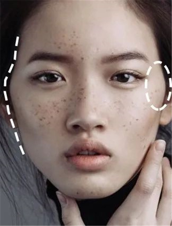 先把修容打在颧弓外侧的最高点上,凸出的位置有多大,修容面积就打多大,不超过外眼角的垂直延长线就好。