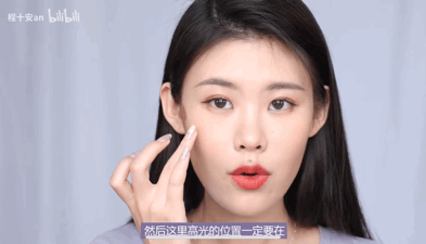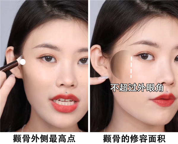 同样是把修容打在颧弓外侧的最高点,高光打在外眼角垂直延长线的下方,面积不要超过太阳穴和颧弓下陷的位置。
