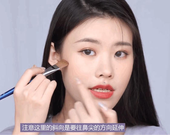 往上提拉打修容,用稍微大点的刷子轻轻带过,不需要完全涂黑,妆面看上去更加干净。