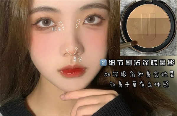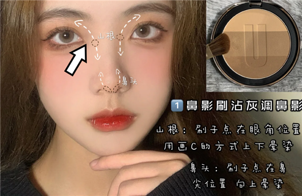 我们修容的时候,要营造鼻梁的立体感,阴影就要打在眉骨鼻梁连接处的内侧,而不是山根处。