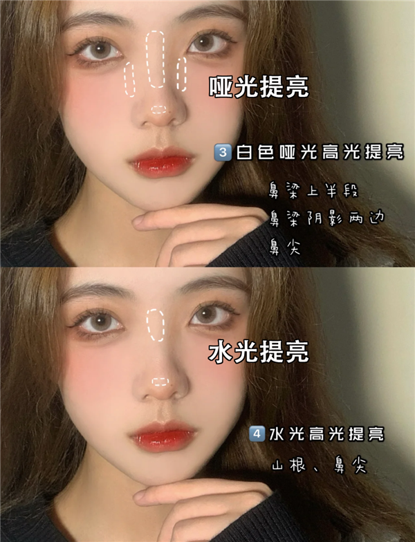 接着用哑光的高光,在鼻梁阴影两边和鼻尖的位置提亮,用水光高光提亮山根,鼻子的修容就画好了。