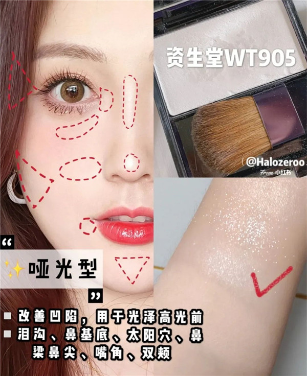 哑光主要用于改善脸型凹陷,多用在面中、太阳穴、眉骨、鼻梁、嘴角的位置。