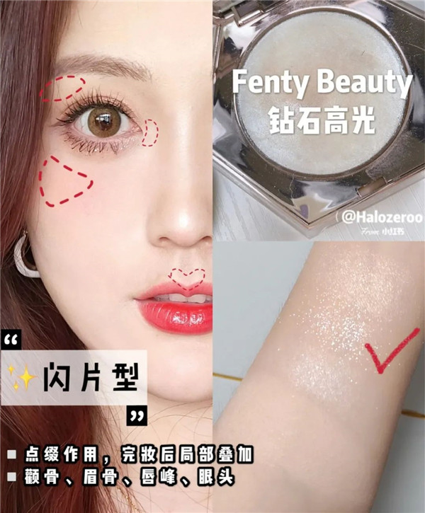 闪片高光作为点缀的作用,自己想突出的位置都可以打上,比如颧骨、眼头这两个地方,用的最多。