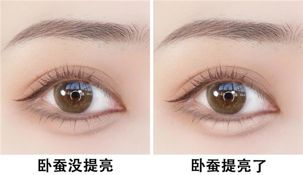 接着用哑光高光去提亮,铺满卧蚕,也是少量多次的叠加法,画出自然又饱满的效果。