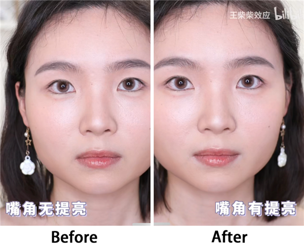 如果你的唇型比较扁平,嘴角下垂的话,也可以通过提亮来提拉嘴部的线条。