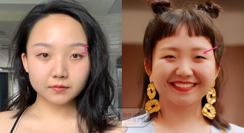 比如原本眉眼距离太大,显得眼睛无神,缩短眉眼距离就会明艳精致很多,眼睛一下子就聚焦了:
