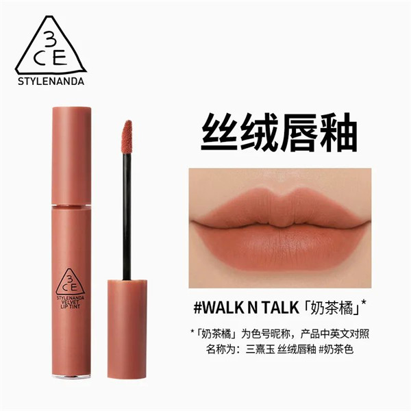 3CE秋冬新品丝绒雾面唇釉唇彩奶茶橘超火WALK N TALK,湿柔的杏仕烤奶色,素颜带妆都可以,诠释高级秋冬调色美学。