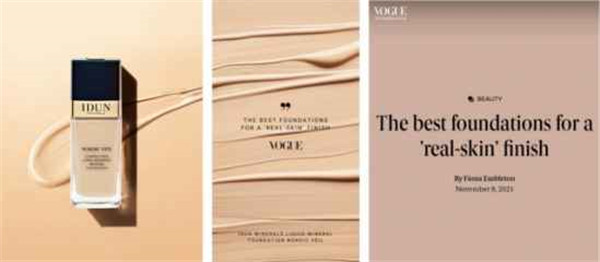 其次,IDUN Minerals NORDIC VEIL“小金瓶”矿物粉底液本月荣登了瑞典VOGUE力荐的“无暇裸妆粉底液”。成分采用高端科技,细腻粉质可以完美吸附肌肤油脂,隐匿毛孔的同时更显自然光泽,还原真实健康肌肤。