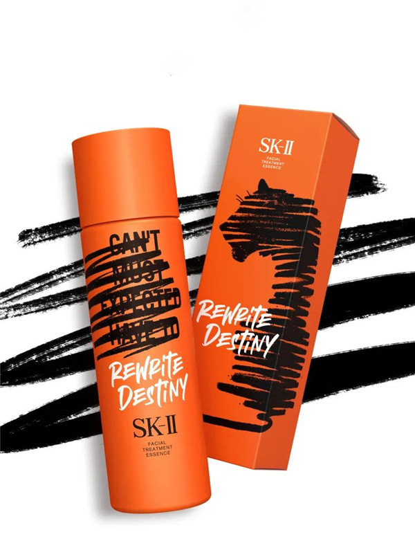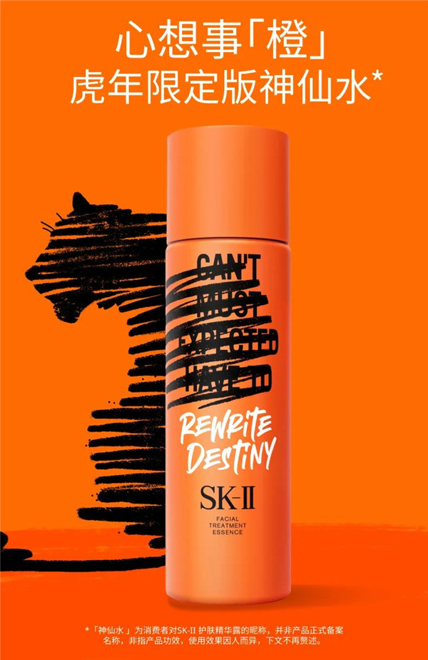 新装SK-II虎年限定版护肤精华露以中国生肖老虎为灵感,瓶身采用大胆撞色设计,充满活力的橙红色,搭配率性的黑色线条涂鸦,老虎形象跃然而上,简约时尚,彰显个性。而老虎果敢顽强、勇猛坚毅的品质,也与SK-II品牌核心理念“命运并非偶然,是选择使然”相契合。每个人都有改写命运的力量, SK-II鼓励广大女性在全新一年里继续遵从内心选择,勇敢改写命运!