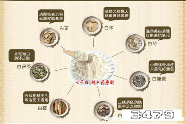 这款中药配方是自古以来就流传下来的,常见七种中药配方是白术、白芍、白芨、白蔹、白茯苓、白芷、白僵蚕,这七种中药按照1比1的比例,各取一份中药粉混合后存放好即可。