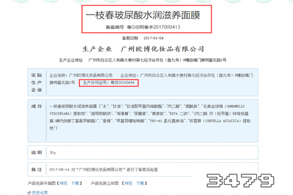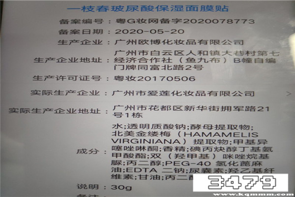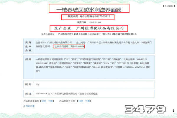 1、这个牌子旗下的面膜有在国家药品监督管理局备案,有自己的生产批号、有自己的生产工厂等。以这款“一枝春 玻尿酸水润滋养面膜”为例,其生产批号是“粤G妆网备字2017000413”,生产许可证号是“粤妆20160694”。如图所示: